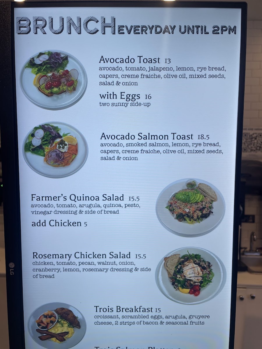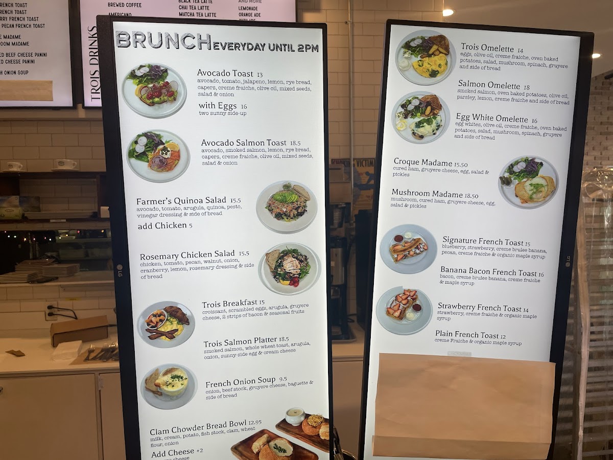 Start your day with warm, simple pleasures like the Trois Blend coffee or explore unique flavors with their Royal Milk Tea. The menu features inviting breakfast choices such as the Salmon Omelette or Mushroom Madame, ideal for those mornings when you want something satisfying yet approachable. Brunch and lunch visitors often enjoy crowd-pleasers like the Signature French Toast, Spicy Chicken Sandwich, and Croque Madame, dishes that balance comfort and subtle sophistication.