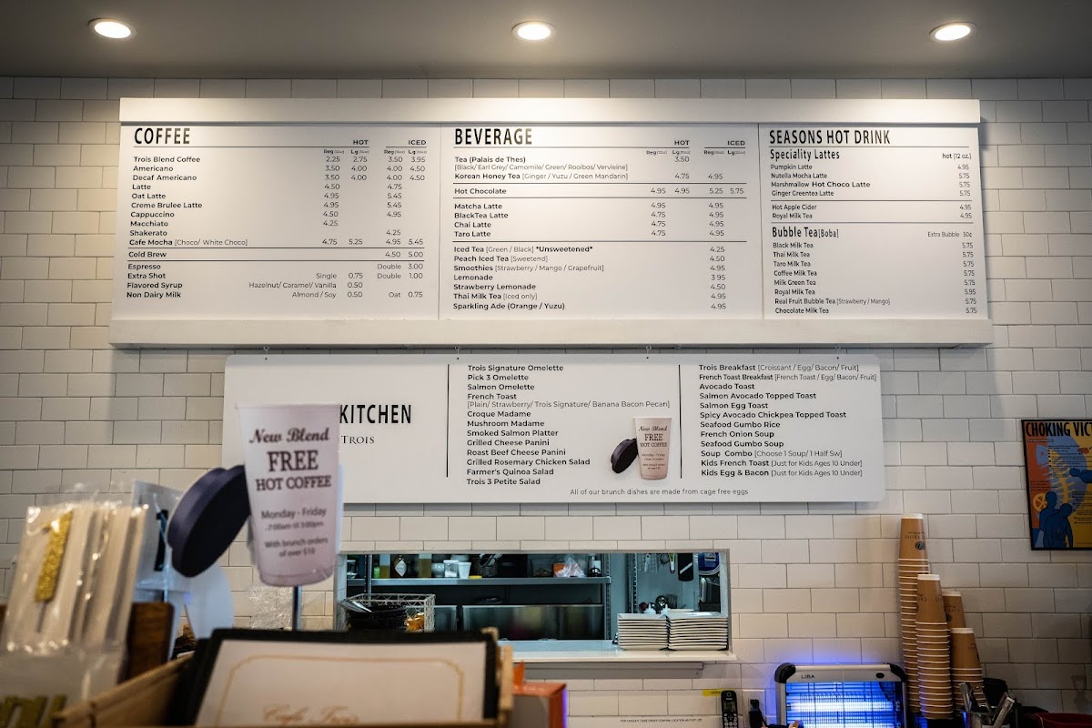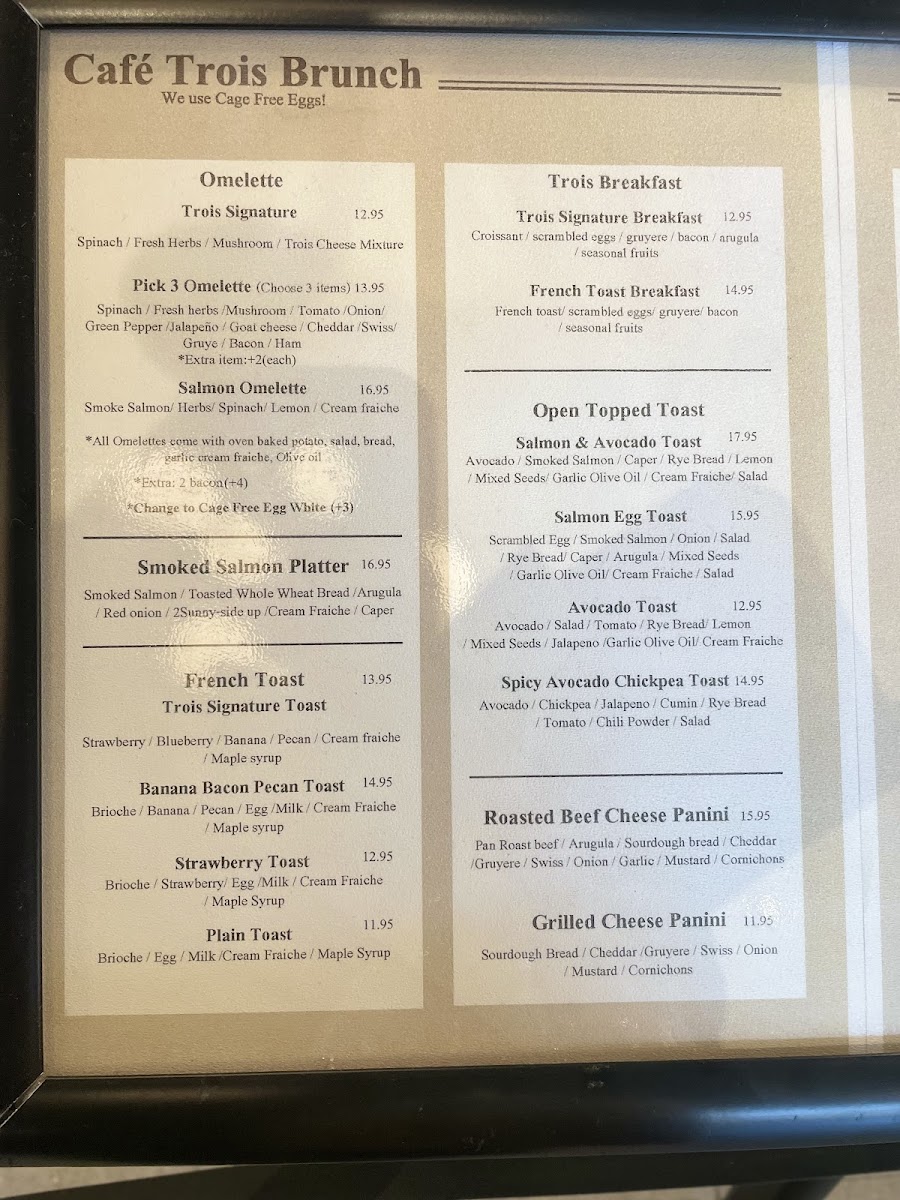 Cafe Trois offers a thoughtfully curated menu that blends casual café favorites with comforting, flavorful bites suitable for breakfast, brunch, lunch, and light dinners. The selection leans into fresh pastries and bakery staples alongside hearty savory options and a variety of handcrafted beverages, creating a relaxed spot where you can settle in for a slow morning or a casual midday break.
